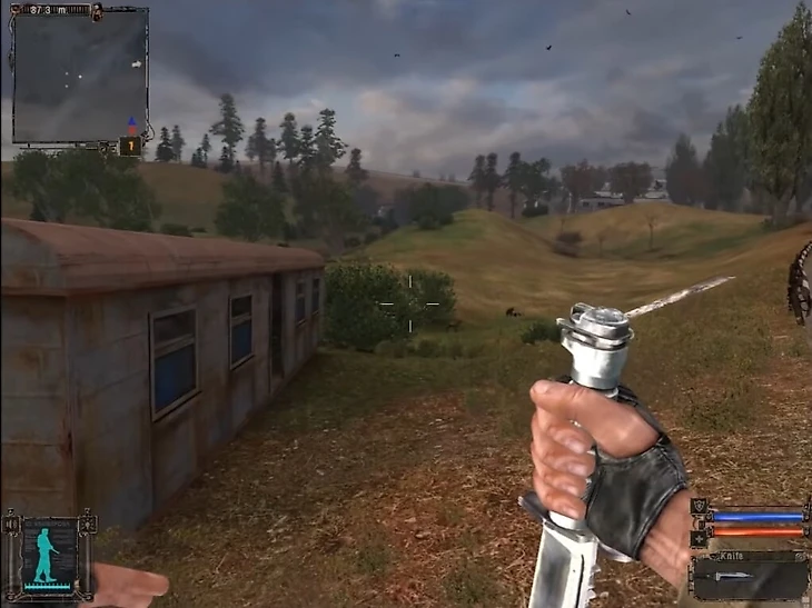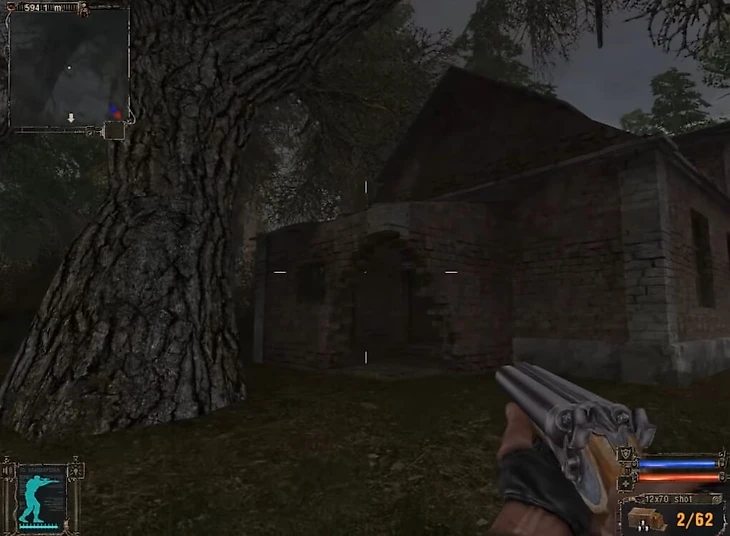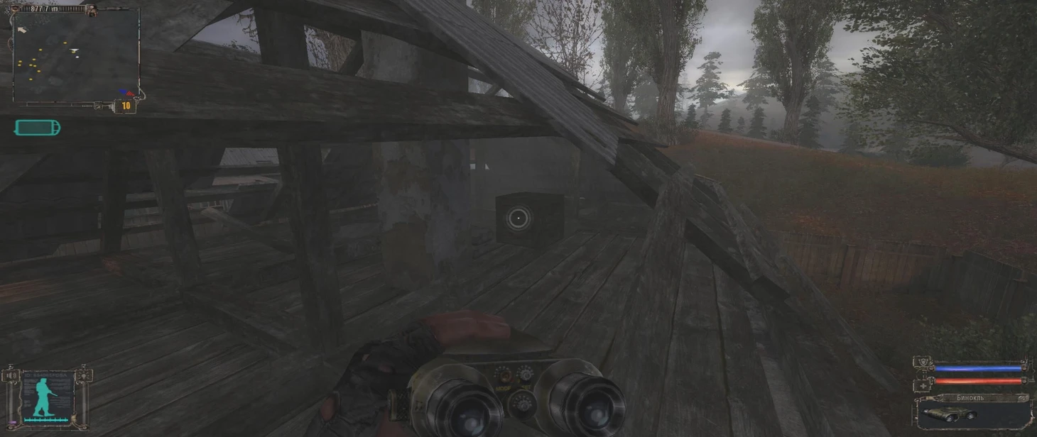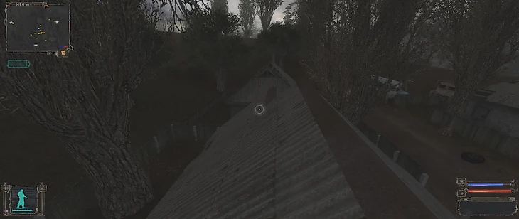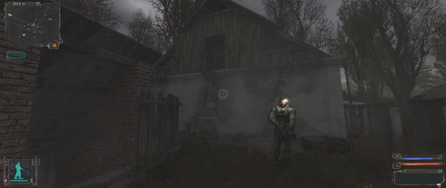 Как только мы прорвемся сквозь заставу военных, нам встретится вольный сталкер Лис. Он обитает в одной из двух разрушенных лачуг – нас интересует та, у которой есть крыша, потому что туда нам и надо забраться.