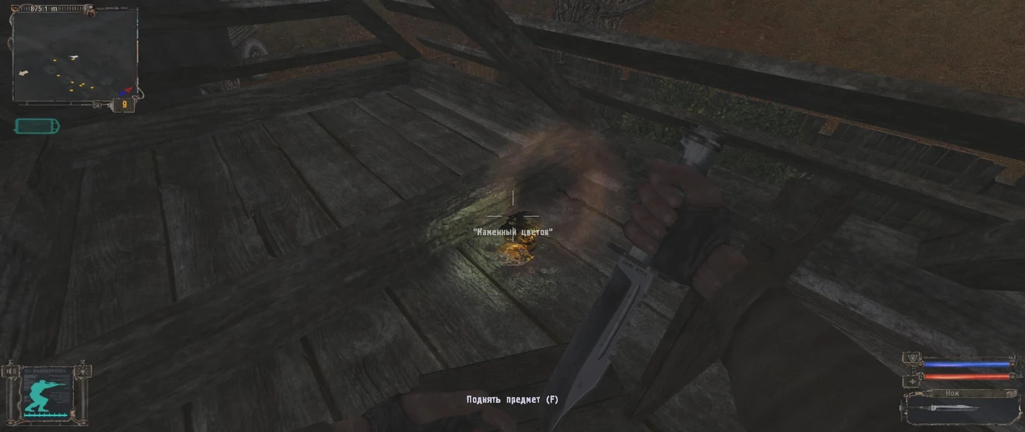 Усилить защиту можно артефактом «Каменный цветок», он тоже рядом. С грузовика на выходе из лагеря запрыгните на дырявую крышу и протиснитесь на чердак. Артефакт лежит в деревянном ящике.
