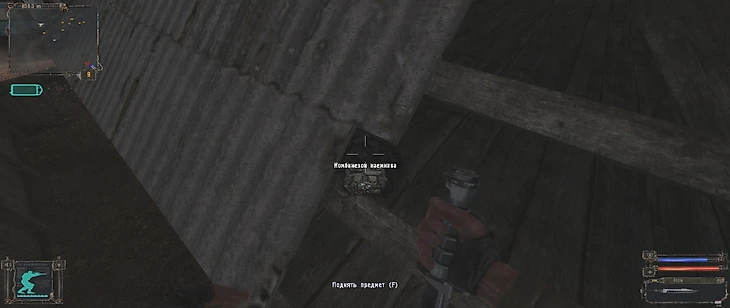 Добраться несложно – залазим на лестницу рядом с костром сталкеров и залазим на крышу, после чего с разбега прыгаем на крышу следующего дома. В углу будет сломана черепица – там торчит ящик. Разбиваем его и получаем топовую для старта защиту.