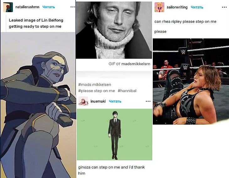 Чаще всего мем-фетиш используют на twitter и tumblr – причем просят наступить на себя не только вымышленных персонажей, но и настоящих, например Мадса Миккельсона.