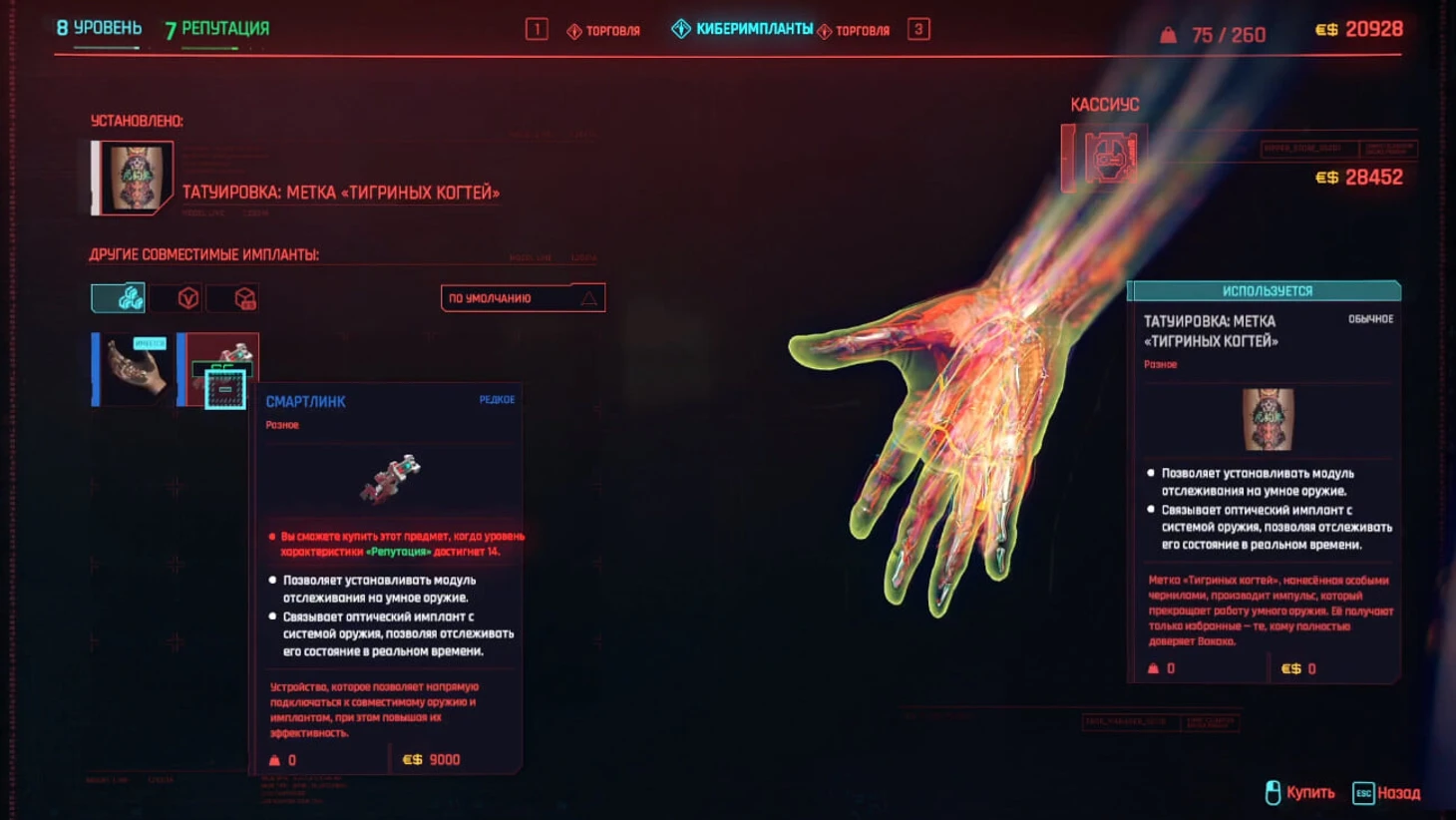 В меню установки киберимплантов выберите татуировку «Тигриных когтей».