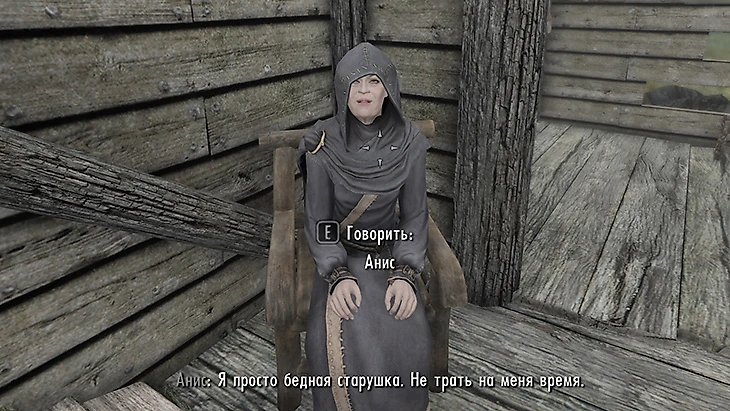 Неподалеку от камней Вора, Воина и Мага неопытный игрок может столкнуться с первого взгляда безобидной старушкой Анис, сидящей у хижины. Она действительно не тронет Драконорожденного, пока тот не залезет в чулан – именно там бабуся прячет ото всех тайну. Она принадлежит к ковену ведьм вместе со своей сестрой Мойрой, только, в отличие от сестры, еще не пережила перевоплощение в омерзительную ворожею.