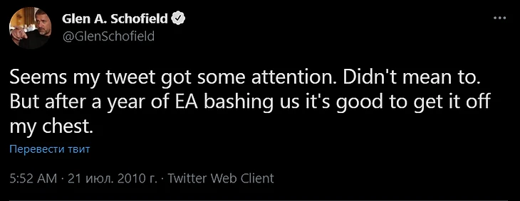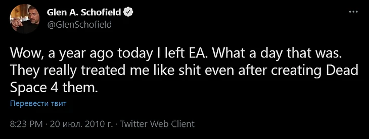 После выхода Dead Space EA Redwood Shores переименовалась в Visceral Games. Глен Скофилд покинул ее вместе с Майклом Кондри и другими коллегами. Спустя год Скофилд посвятил EA пару гневных твитов. «Вау, год назад я ушел из Electronic Arts. Что за день! Они ужасно ко мне относились даже после создания Dead Space для них». И чуть позже добавил второй, но не с извинениями, как вы могли подумать: «Кажется, мой твит привлек внимание, я этого не хотел. Но после года порки от EA я просто рад облегчить душу».