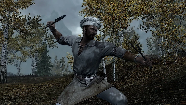 Отыгрыш поехавшего шеф-повара – это чертовски весело. Из оружия мы будем пользоваться только ножом и вилкой. Для того, чтобы это «оружие» стало эффективным, понадобится прокачать алхимию для создания большого количества парализующего яда и зачарование, чтобы повысить урон от одноручного оружия. Обязательно забираем поварский колпак по ходу квеста от темного братства. Он ничего нам не даст, но без него будет скучно.