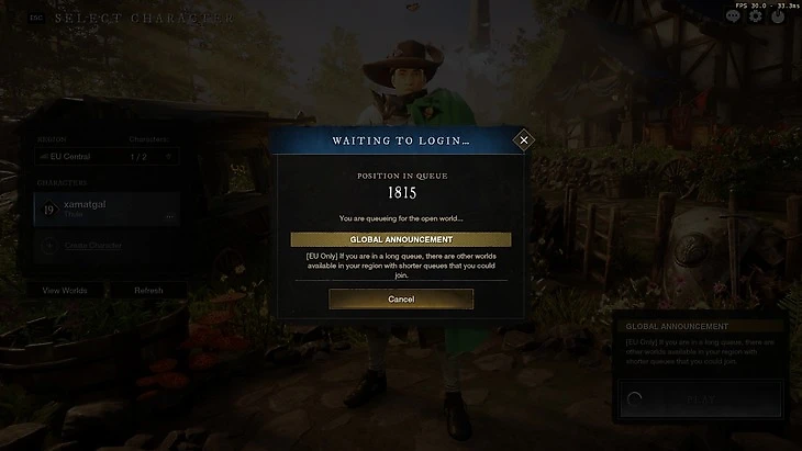Если вы надеялись запустить New World и сразу поиграть, то нет, сначала нужно отстоять очередь. Первое, что увидите в главном меню, – это проклятое число: в рабочие часы может быть 170, а в вечерний прайм-тайм – 2600. Это все живые люди, поэтому число будет медленно уменьшаться – приходится ждать часами. И приготовьте музыку заранее – мелодия из главного меню быстро надоест.