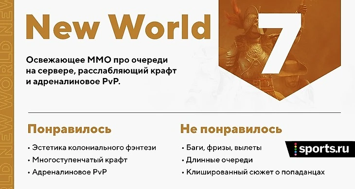 New World – это отличная MMO для фанатов жанра, которым хочется нового опыта: здесь и редкий сеттинг колониального фэнтези, и 17 видов крафта, и тактические битвы, требующие отличной реакции и продуманных действий. Однако сейчас заходить в игру можно только в будни и по утрам. Вечером или в выходные придется сидеть в очередях или страдать от наплыва задротов, которые прокачались за неделю и хотят самоутвердиться за ваш счет. Если вы терпеливы и можете тратить десятки часов на расслабляющую прокачку и крафт, то в игре можно жить. Да и выключать ее совсем не хочется, ведь потом снова в очереди стоять...