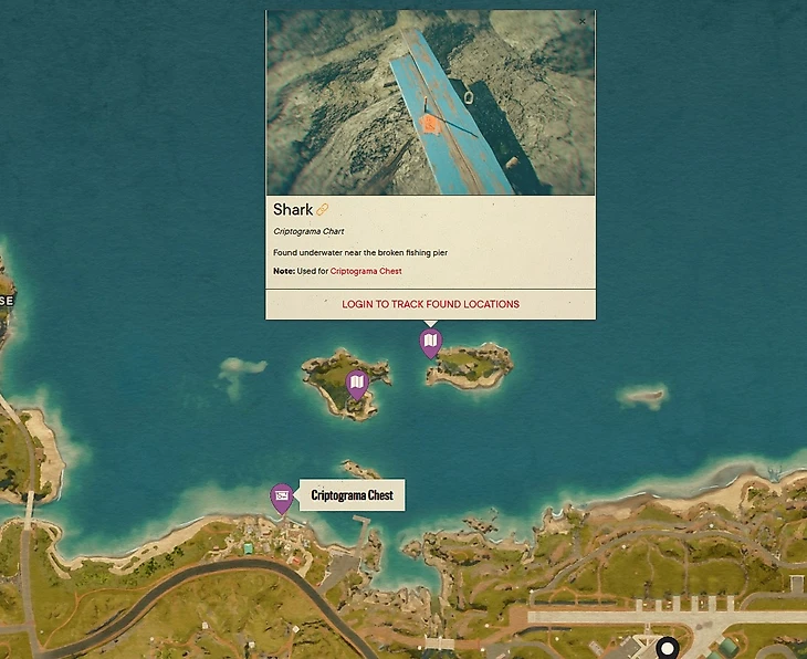 Сундук со следующей добычей находится на северном побережье Агуас-Линдас западнее пристани. Криптограмма Яранская королева бабочек расположена на массивном, но небольшом островке севернее побережья. Изображение будет приколото на вершине камней. Криптограмму Акулы вы найдете под водой вблизи второго островка на синей доске.