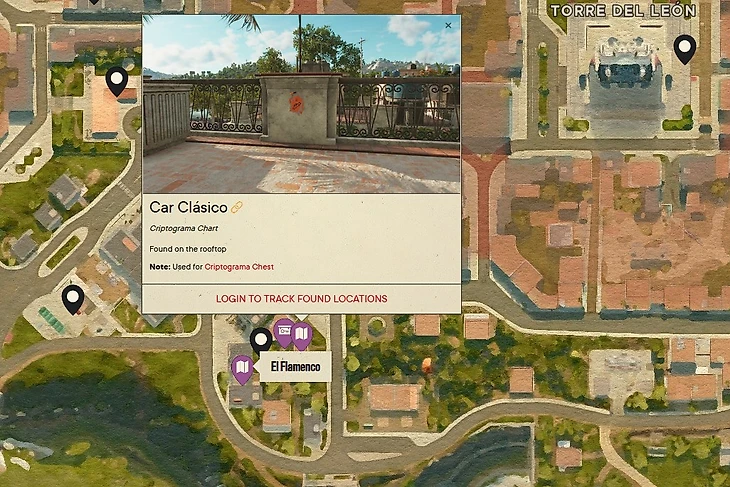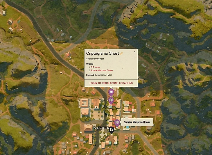 Прежде чем открывать сундук, стоит найти криптограмму Эль Тромпо и Цветок рассветной Орхидеи. Первая находится на крыше здания напротив рекламного щита. Изображение прикреплено к водонапорной башне.