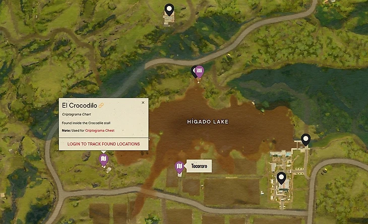 Чтобы получить награду, найдите криптограмму Токороко и Эль Крокодило спрятаны на противоположном берегу озера Игадо. Первую вы отыщите в деревянном домике на стене, а другую ищите в стойле с крокодилами.