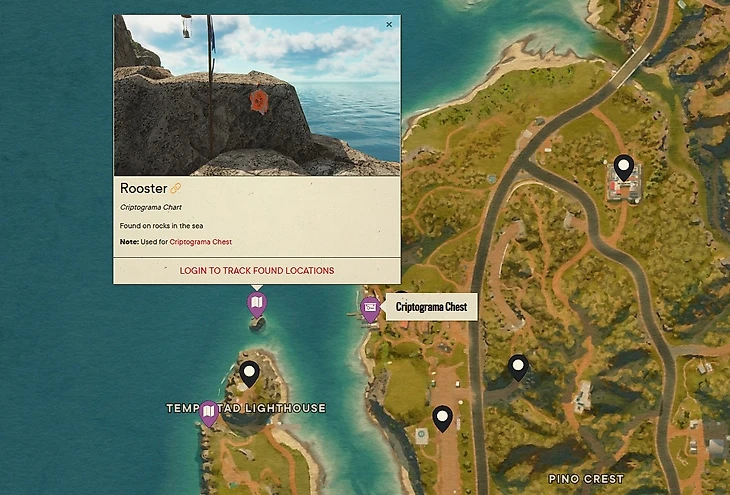 Криптограмма Петуха находится напротив маяка на маленьком островке из скал. Там будет приколото нужное изображение для открытия сундука. Наградой будут «Перчатки мятежника М-2», увеличивающие урон в ближнем бою.