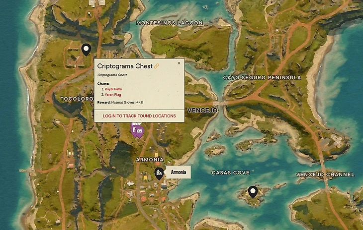 На стартовом острове находится первый сундук с добычей. Для этого нужно отправиться в западную часть Венсехо. Сундук с криптограммой найдете северо-западнее от города Армонья.