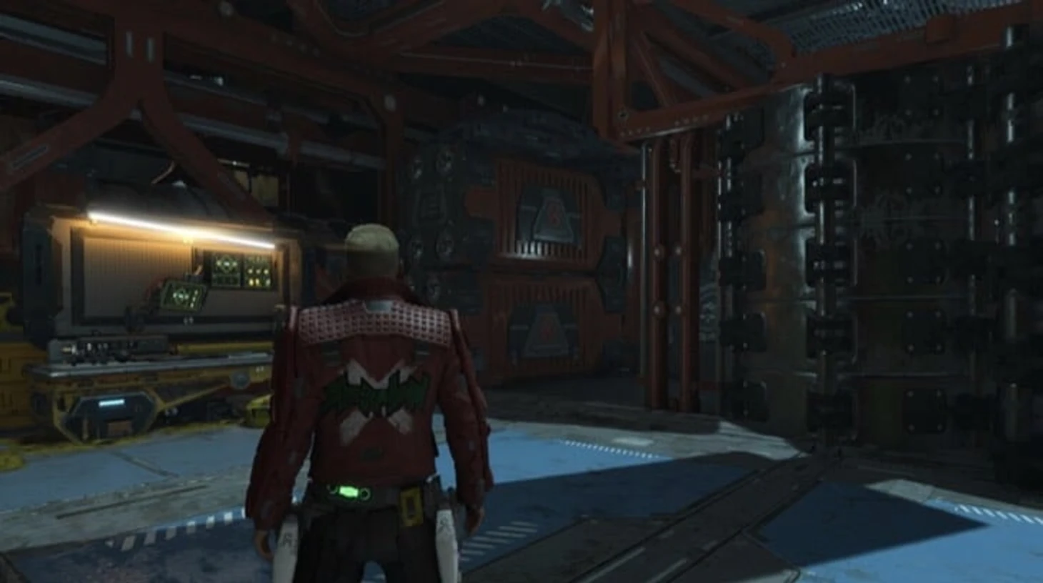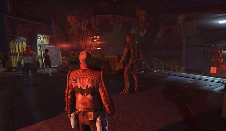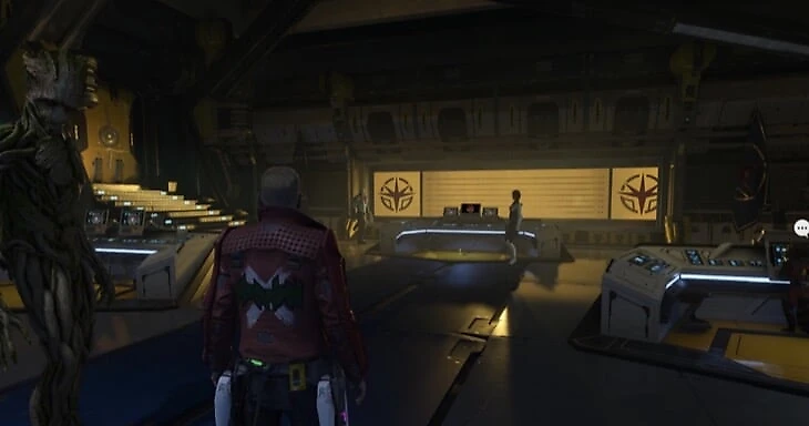 После кат-сцены, в которой Ракета взламывает устройство связи и Стражи обсуждают Обещание, войдите в следующую комнату и подойдите к верстаку. Справа будут шестерни, по которым можно залезть, а также предмет.