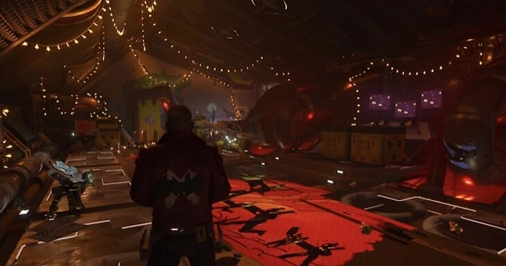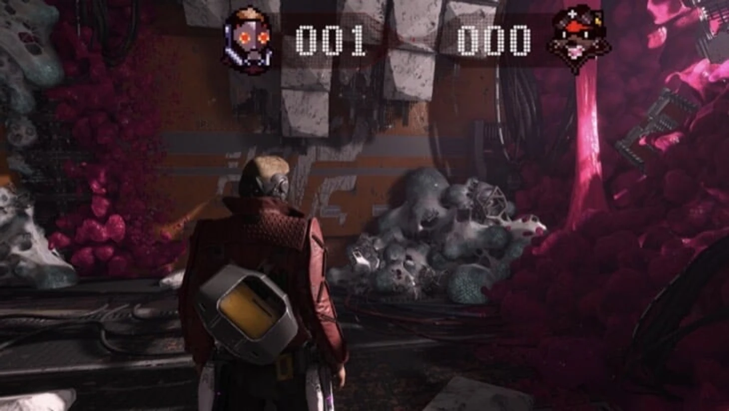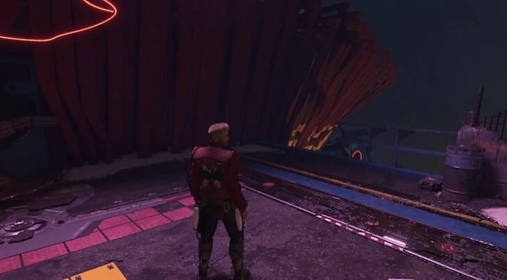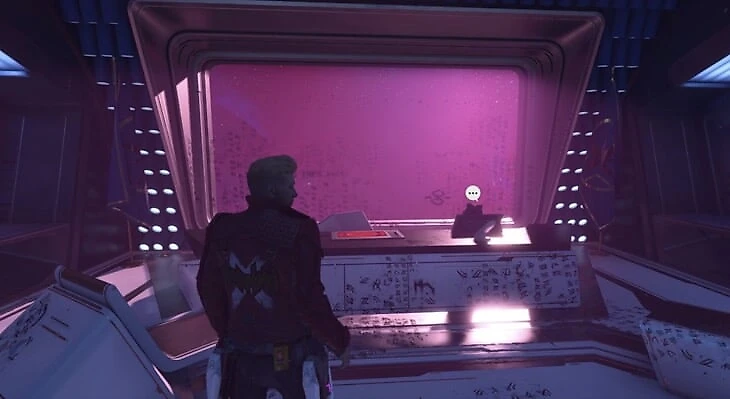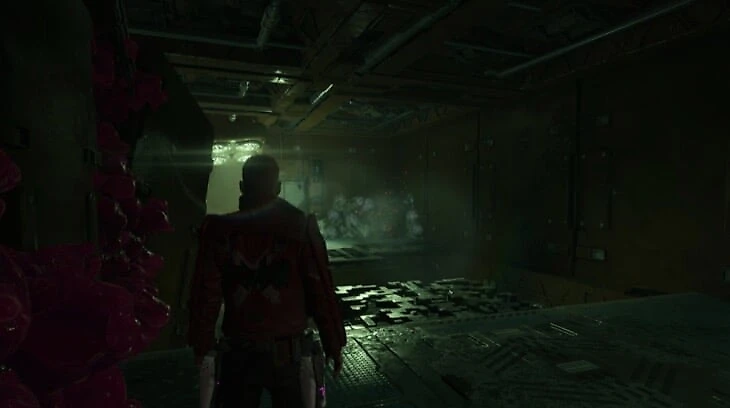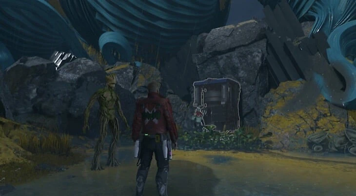 Когда Ракета начнет пари со Звездным Лордом и добавит счетчик в верхнюю часть экрана, пробегите через уничтоженный корабль и спрыгните на нижний уровень во время кат-сцены. Пройдите через узкий прохож. В следующей комнате нужно расстрелять серую массу справа, которая скрывает предмет.