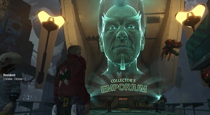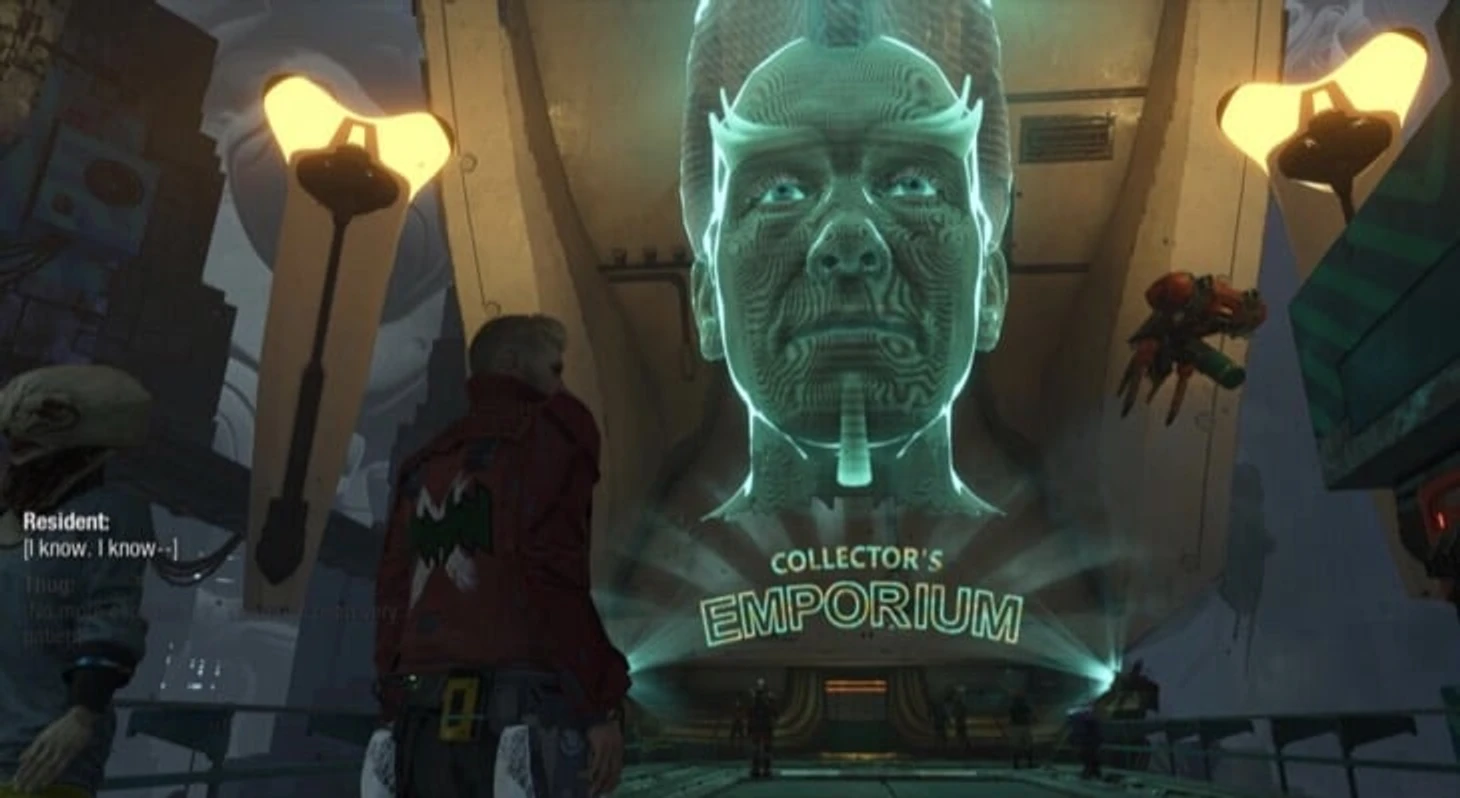 Во время сцене в баре с Безгубым, если вы успешно повторите его песню, он даст вам билет в Империум. Отправляйтесь на выставку – ее сложно не заметить: это здание с большой синей головой. Войдите, использовав полученный билет, чтобы не платить 5000 кредитов. Теперь идите в сувенирный магазин и купите предмет за 2000 кредитов.