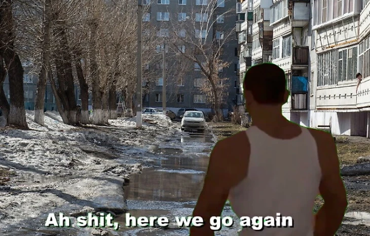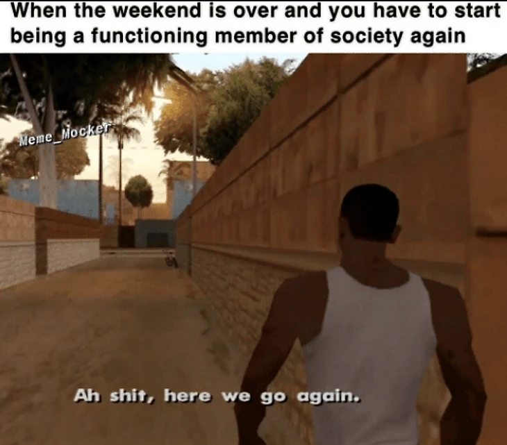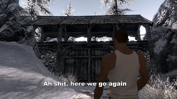 Первая катсцена из GTA: San Andreas, в которой главный герой Сиджей возвращается в город с фразой: «Ах дерьмо, здесь мы идем снова», или же «Черт подери, снова я тут», стала очень популярным мемом. Сначала плашку с недовольным Сиджеем лепили на моменты из других игр.