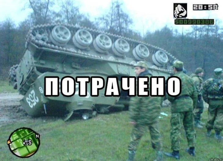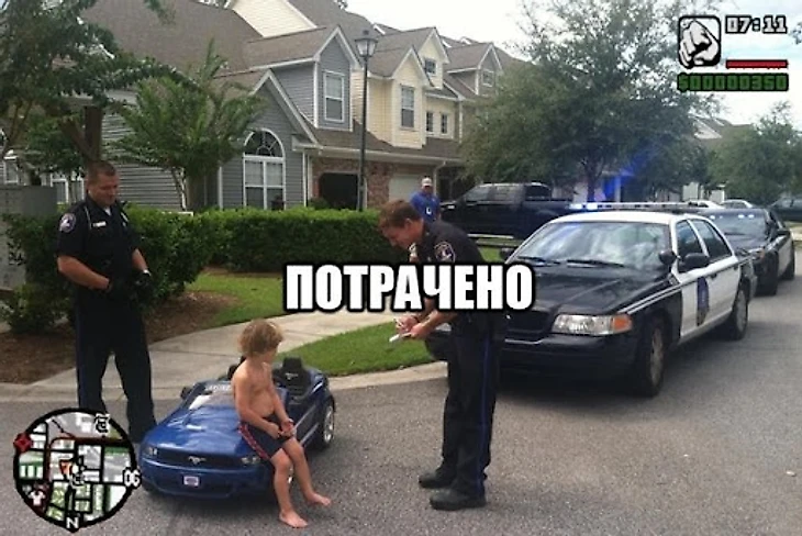 Пиратский русский перевод GTA: San Andreas подарил еще одну меметичную фразу «Потрачено» («Wasted» в оригинале). Эта надпись появляется каждый раз после смерти персонажа. Ее стали лепить на любые фото с упавшими людьми или неловкими ситуациями.