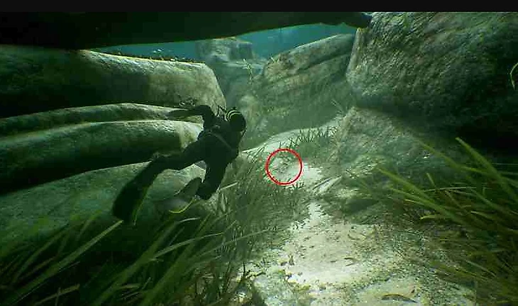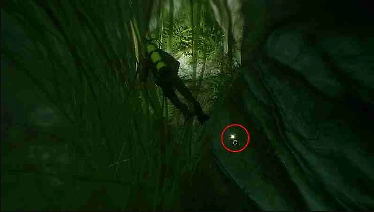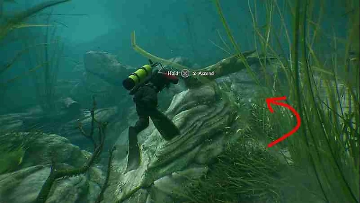 Третий предмет придется поискать. На дне водоема есть красный контейнер. От него нужно повернуть направо и плыть к скале. За травой будет светиться сокровище.