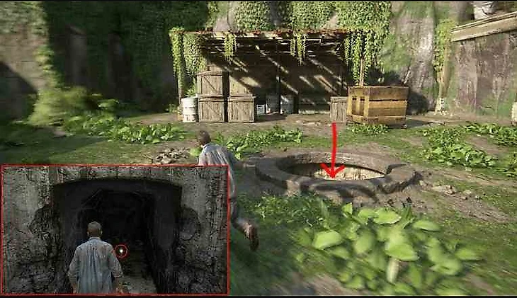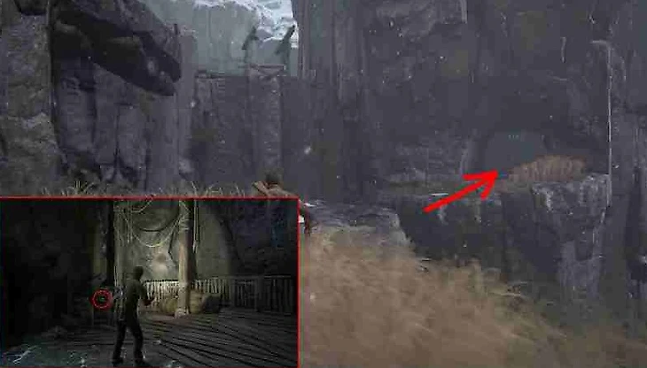 Среди скал будет сломанная лестница. Нужно подождать Сэма и посмотреть направо. В скалах вновь будет пещера. Чтобы оказаться внутри нужно преодолеть пропасть. Сокровище будет лежать в бочках возле входа.