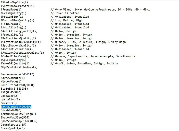 В открывшемся файле найдите значение ExtraGameFov и поменяйте цифру в скобках, допустим, на 50. Сохраните через Ctrl+S и проверяйте в игре. Через файл всегда можно откатиться к предыдущему значению или, напротив, увеличить его еще больше.