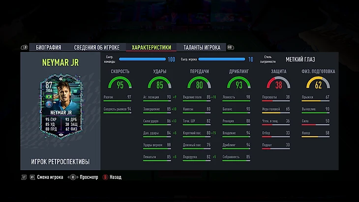 Более детальный разбор уже не так впечатляет. Базовый Неймар и так не нуждается в улучшении скорости: его используют со стилем сыгранности «Охотник», который добивал ее до максимума.