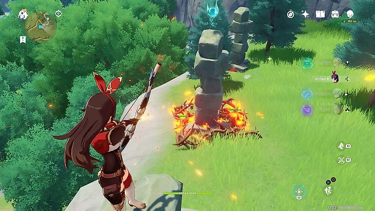 Пятый анемокул будет на каменном столбе. Можно сжечь шипы, а можно взобраться на колонны поблизости.