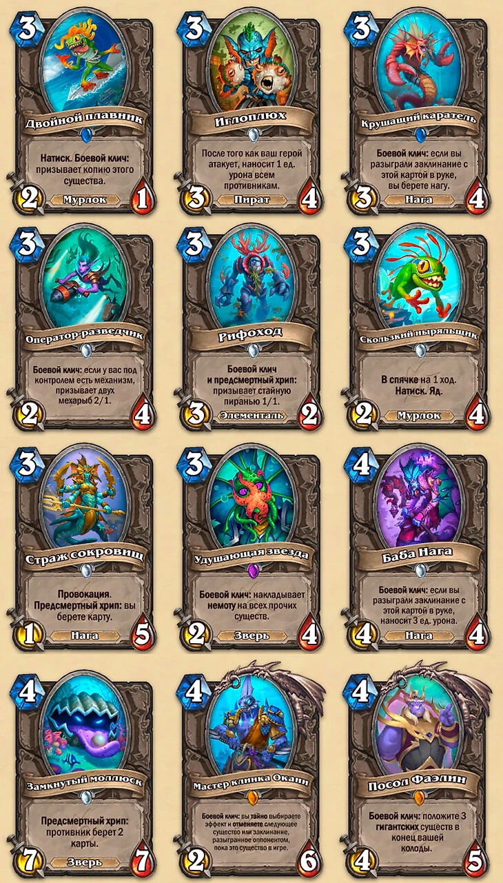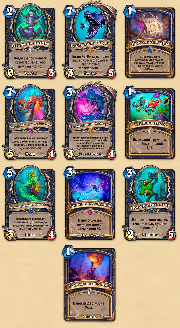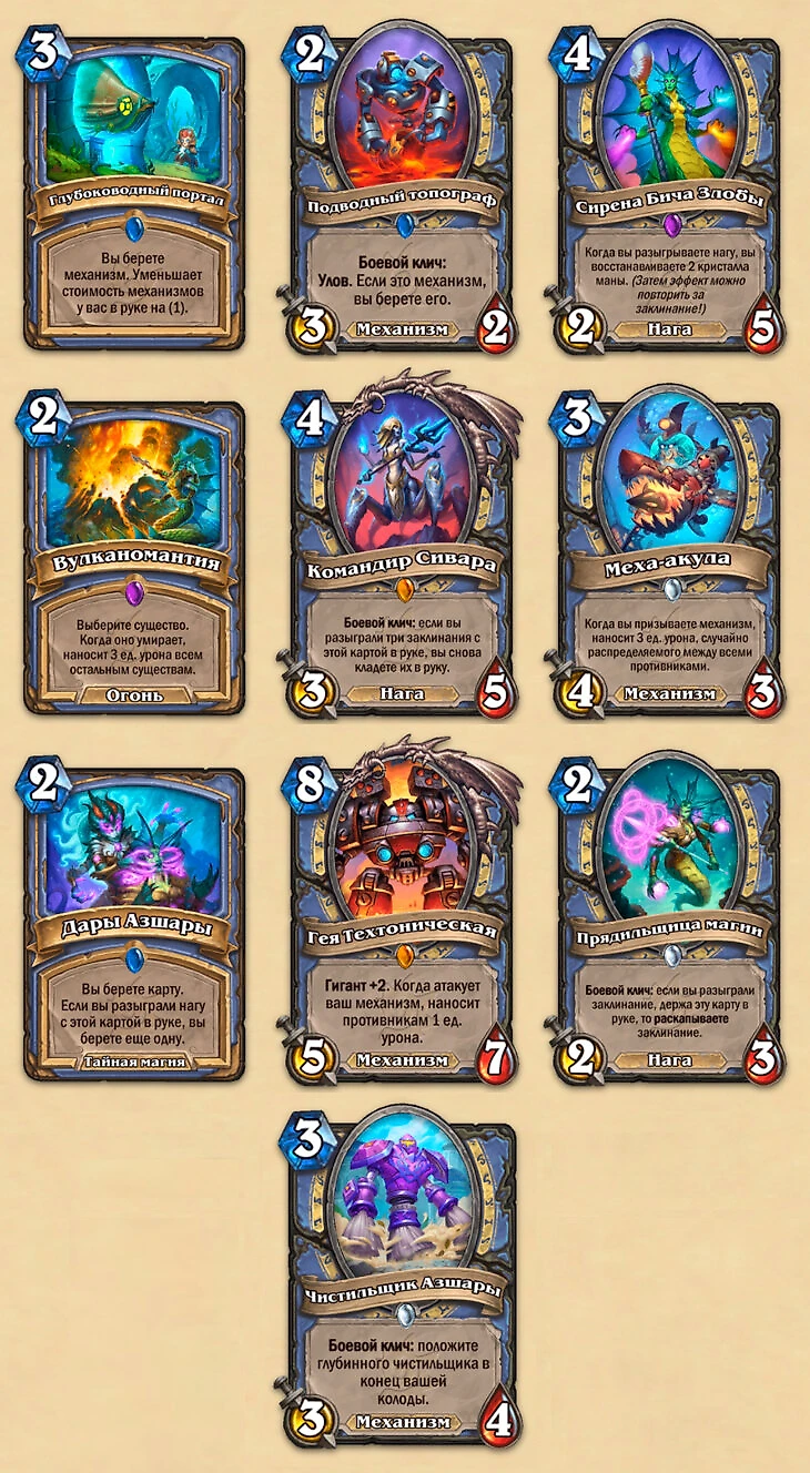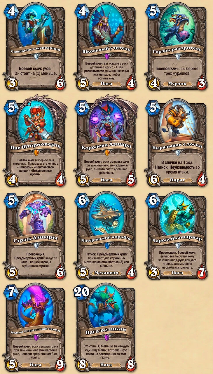 На смену зверям у Рексара пришли наги. Blizzard хочет воскрешения колоды, состоящей преимущественно из заклинаний, поэтому новые заклинания синергируют с нагами, особенно это заметно по специальному добору – «Зов ракушки».