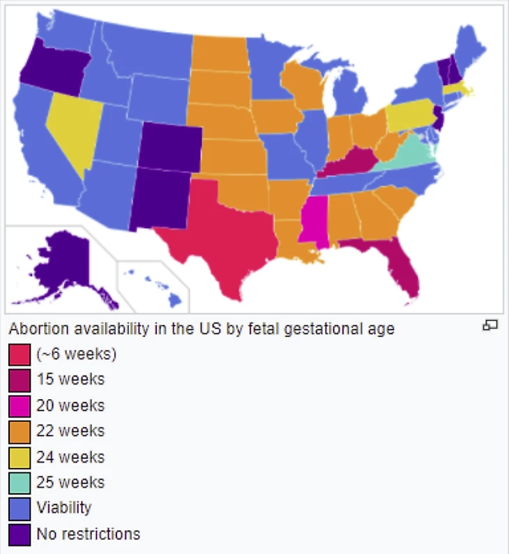 Со временем в разных штатах появились разные поправки. На картинке изображено, до какой недели женщина может прервать беременность – от шестой в Техасе до 20-25 во многих штатах.