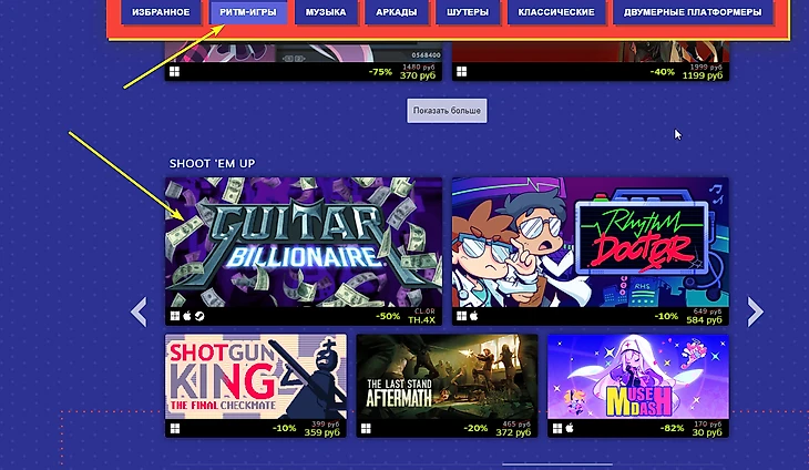 На странице «Аркады и ритм-игры» переходите в поджанр «Ритм-игры», пролистайте страницу до «Shoot’em up». Ответ – Guitar Billionaire (Гитарный миллиардер), нажмите на игру и получите награду.