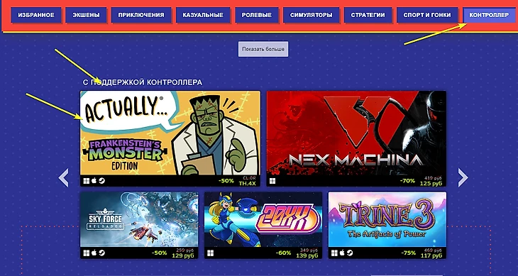 На странице «Кооперативные игры» переходите на поджанр «Контроллер», категория «С поддержкой контроллера». Ответ – Между прочим...: чудовище Франкенштейна и не только (Actually... Frankenstein’s Monster Edition), нажмите на игру и получите награду.
