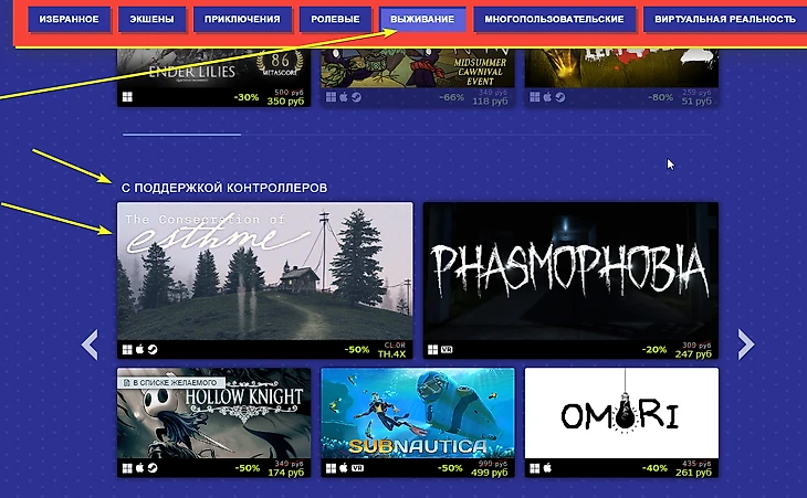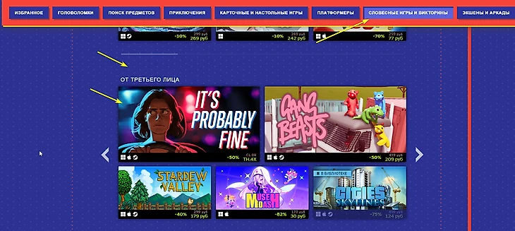Точное расположение игр (поджанр и категория) могут меняться. Если игры нет в той категории или поджанре, которая написана в этом текстовом гайде, ищите обложку игры в других поджанрах и категориях.