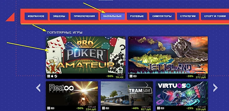 На странице «Продукты для VR» переходите на поджанр «Казуальные», категория «Популярные игры». Ответ – Профессиональный покерист-новичок (Pro Poker Amateur), нажмите на игру и получите награду.