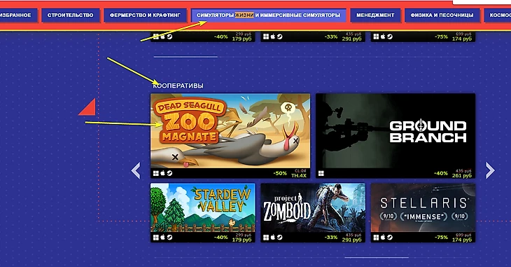 На странице «Симулятор» переходите на поджанр «Симуляторы жизни и иммерсивные симуляторы», категория «Кооперативы». Ответ – Владелец зоопарка мёртвых чаек (Dead Seagulls Zoo Magnate), нажмите на игру и получите награду.