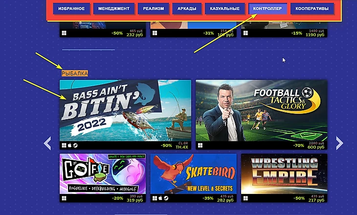 На странице «Спортивные игры» переходите на поджанр «Контроллер», категория «Рыбалка». Ответ – Окунек не клюет (Bass Ain’t Bitin’ 2022), нажмите на игру и получите награду.