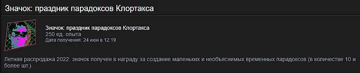Когда закончите квест, не забудьте нажать на зеленую кнопку на его странице для получения наград. Также вы получите значок праздник парадоксов Клортакса. Он дает 250 единиц опыта для вашего профиля Steam.
