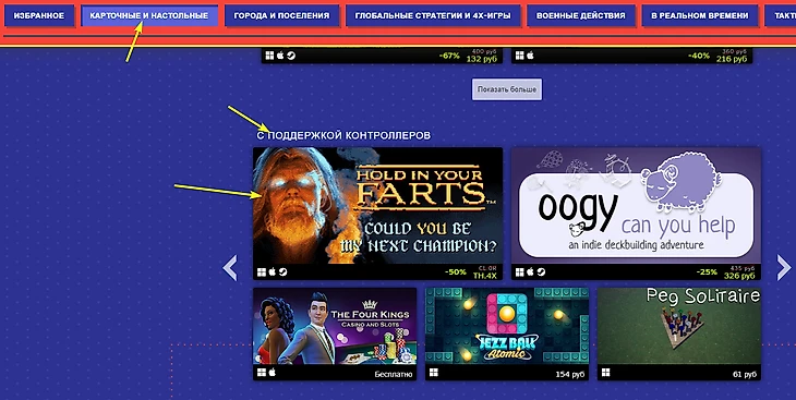 На странице «Стратегии» переходите на поджанр «Карточные и настольные», категория «С поддержкой контроллеров». Ответ – Смотри не пукни (Hold In Your Farts), нажмите на игру и получите награду.