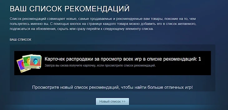 Вам предложат готовый список рекомендаций или попросят создать новый. Создавайте и вы попадете в очередь рекомендаций. Просто прокликайте все игры в списке, чтобы получить карточку для значка Steam 3000. Повторяйте процесс каждый день, пока действует распродажа.