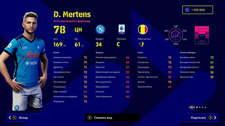 Юркий бельгиец из «Наполи» постарел, но все еще тащит. Мертенс получил сбалансированные статы и готов сыграть в любой атакующей роли. Когда вы найдете игрока получше, навык суперзамены сделает из Дриса опасного джокера.