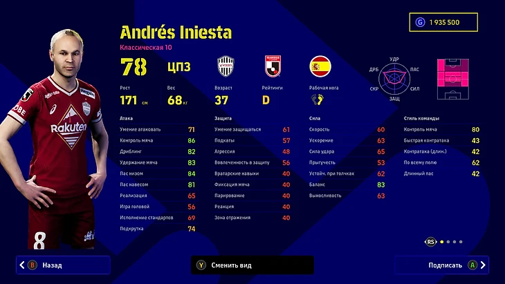 Иньеста – лицо проекта Konami, поэтому даже в 38 лет у него отличные технические показатели. Особенно впечатляют навыки паса – Андрес без труда отдаст мяч в касание! После прокачки скорости Андрес станет одним из лучших плеймейкеров футсима.