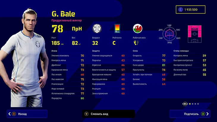 Статы Бэйла далеки от премиальных, но он остается топ-игроком. Скорость спринта, дальние передачи и навык точных подач делают из валлийца отличного игрока фланга. При желании из Бэйла можно вылепить форварда – тогда у него появятся шикарные штрафные удары.