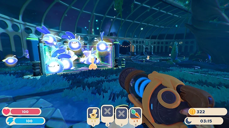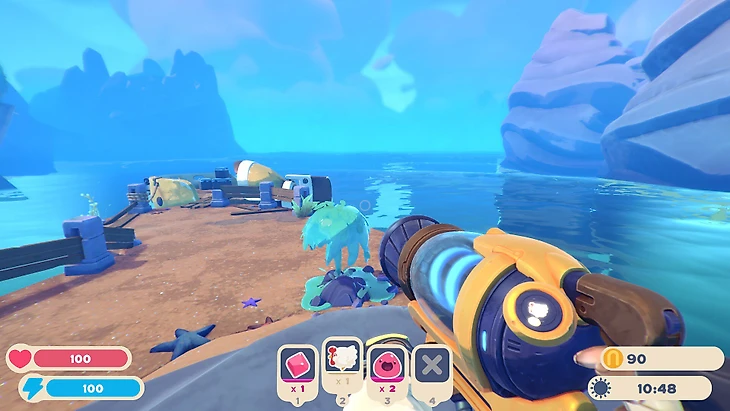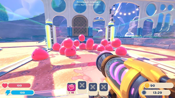 Если накормить лизуна вкусняшкой, он выделит ценный материал – торговцы охотно за него заплатят. Так что берем пушку, которая не стреляет, а всасывает, и бежим ловить слаймов. Затем тащим существ до базы, грузим их в загон и кормим. Чем вкуснее еда и комфортнее условия, тем солиднее будет добыча.