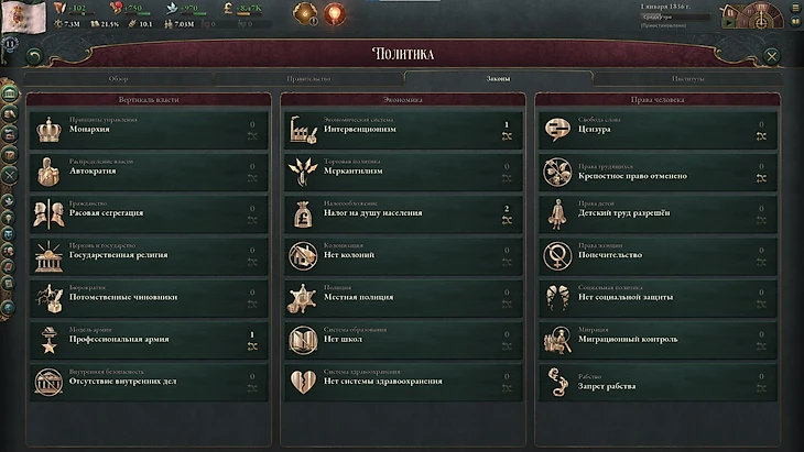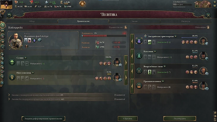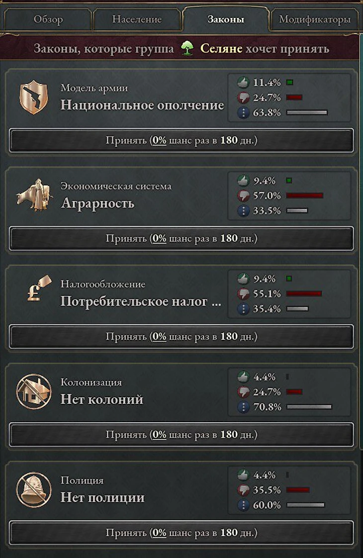 Но что, если вы хотите изменить какой-нибудь закон, например, отменить крепостное право или ввести прогрессивный налог? Для этого нужно, чтобы такой закон поддерживала влиятельная Заинтересованная группа. Чем больше групп будут поддерживать закон, тем больше шанс быстрого принятия. Можно добавить подходящие группы в правительство, повышая его легитимность. Но если вы добавите группы с низкой поддержкой населения, легитимность упадет, с ней снизятся и шансы на принятие любых законов.
