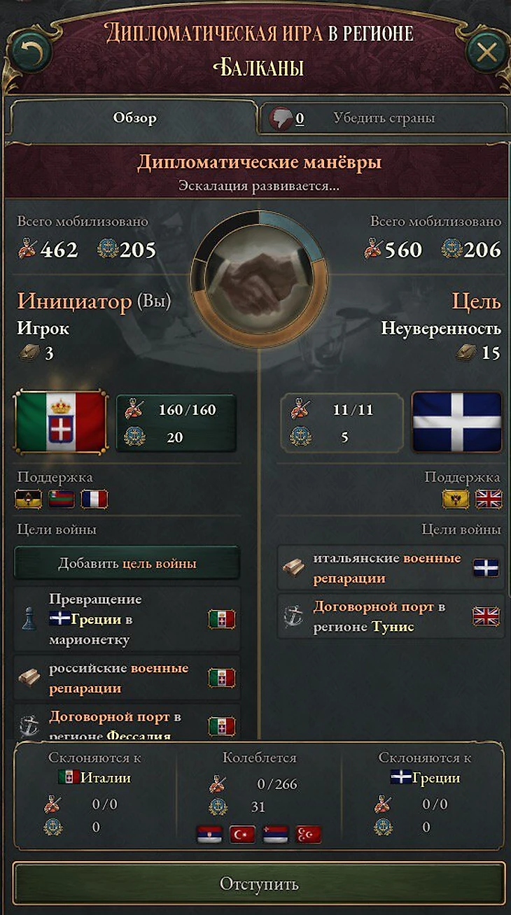 Италия объявила Греции о намерении сделать ее марионеткой. На сторону Италии встала Австрия, связанная с ней союзными обязательствами. Греция, желая сохранить суверенитет, выдвинула свою цель – итальянские военные репарации. Так как в одиночку с итальянцами и австрийцами не сдюжить, Греция обратилась за помощью к Великобритании, предложив в случае победы забрать у Туниса (находившегося под итальянским протекторатом) территории договорного порта. Итало-Австрийский блок делает шикарное предложение Франции – передать в случае военной победы часть британских колоний в Африке (это уже не влезло в скриншот). На сторону Греции в европейскую заваруху вступает Российская империя. Зачем? Из-за престижа.