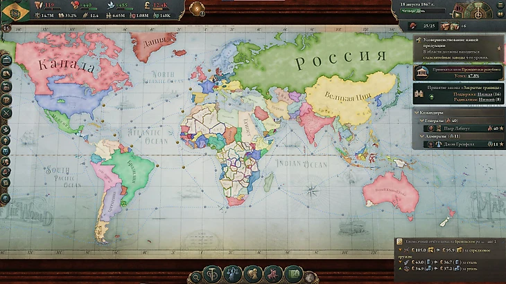 Изучать игру очень увлекательно, в первую очередь из-за проработанной иммерсивности. Оформление интерфейса, музыка, иллюстрации – все работает на погружение в 19 век, его темп и противоречия. При этом все страны воспринимаются одинаково: мои партии за Италию, Германию, Францию и Бельгию мало чем отличались друг от друга. Каждая партия за любую страну заточена под один сценарий: развитие добывающей промышленности и сельского хозяйства, индустриализация, демократизация политики, электрофикация, Великая война в лейт-гейме. Игре очень не хватает региональных особенностей в механиках, локальных ивентов и событийных цепочек.