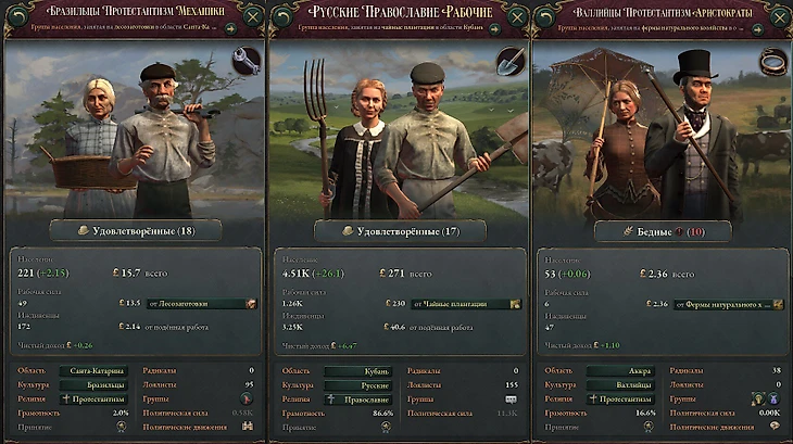 Геймплей в Victoria 3 прежде всего завязан на управлении населением страны, за которую вы играете. Каждого жителя в игре можно классифицировать по четырем параметрам: культура (например, русская), регион проживания (Кубань), религия (православие) и род занятий (рабочий на чайной плантации). Жители с четырьмя совпадающими параметрами объединяются в Группу населения. Даже внутри одной провинции могут сосуществовать сотни различных групп.