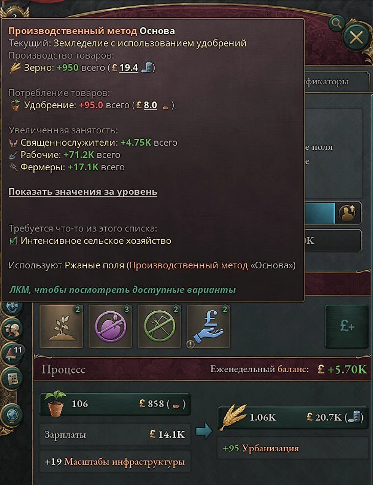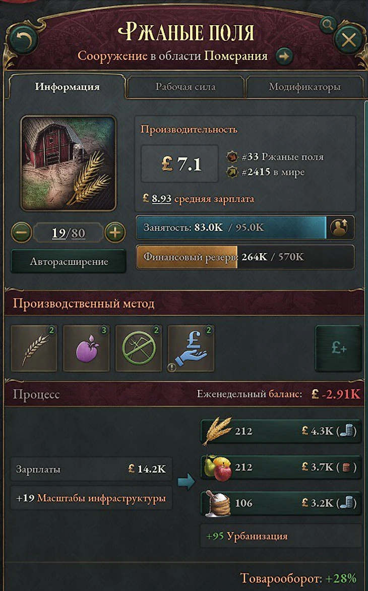 Управлять экономикой можно через цепочки эффективных производств. Разберем на примере зерна (его потребляют абсолютно все жители планеты). Для производства зерна я построил Ржаные поля. Текущий Производственный метод позволяет производить зерно, фрукты и сахар, ограничиваясь только затратами на зарплаты. В нынешней экономической ситуации это не очень эффективно.