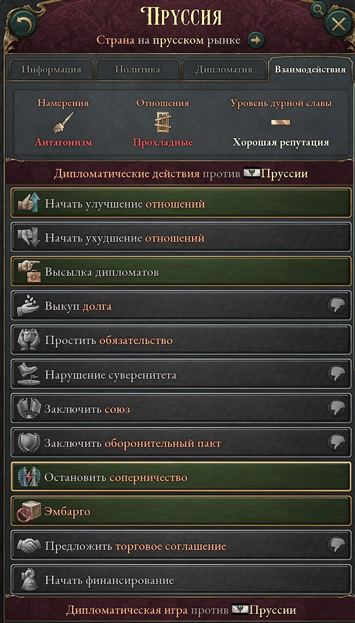 В отличие от Hearts of Iron или Civilization, в которых нужно завоевать мир, «Виктория» – не про покрас карты. Однако многие внутренние проблемы можно решить с помощью других стран. Хорошие отношения с соседями укрепляют экономические связи и делают торговые пути более эффективными. В игре доступно 12 «мирных» дипломатических действий, которые открываются в зависимости от уровня отношений.