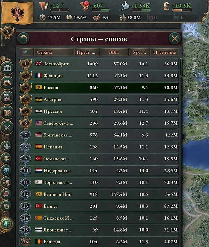 Совокупность военной мощи, ВВП, колоний и культурных инноваций отражают Престиж государства. В каком-то смысле, глобальная цель в игре – забраться выше в рейтинге стран. Великие державы – мировые лидеры – ведут постоянную борьбу между собой. В случае греко-итальянского кризиса, Российская империя вписывается только для того, чтобы поучаствовать в военном разгроме Франции и занять ее строчку.