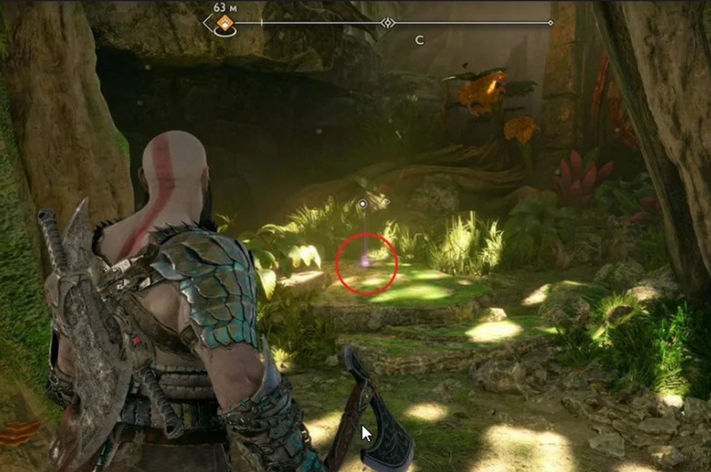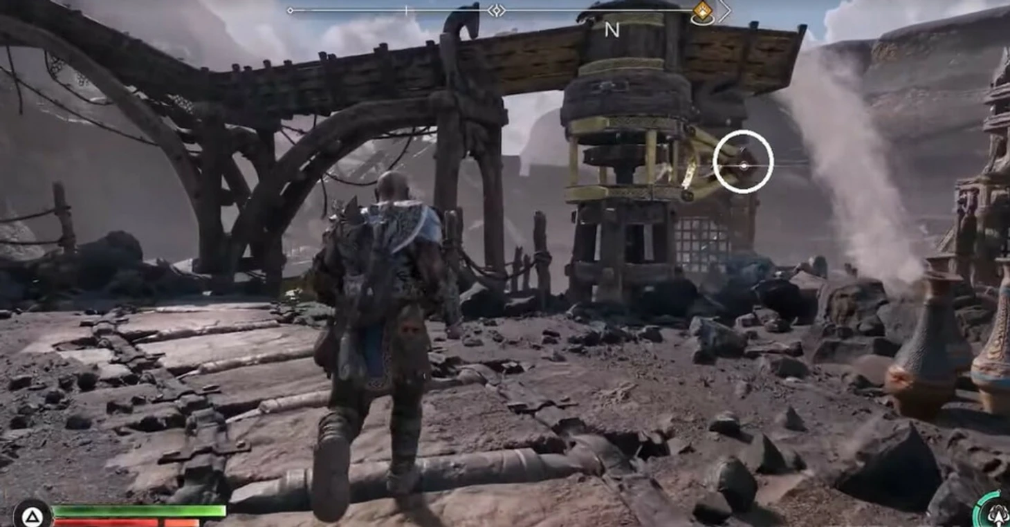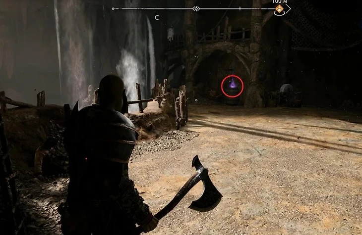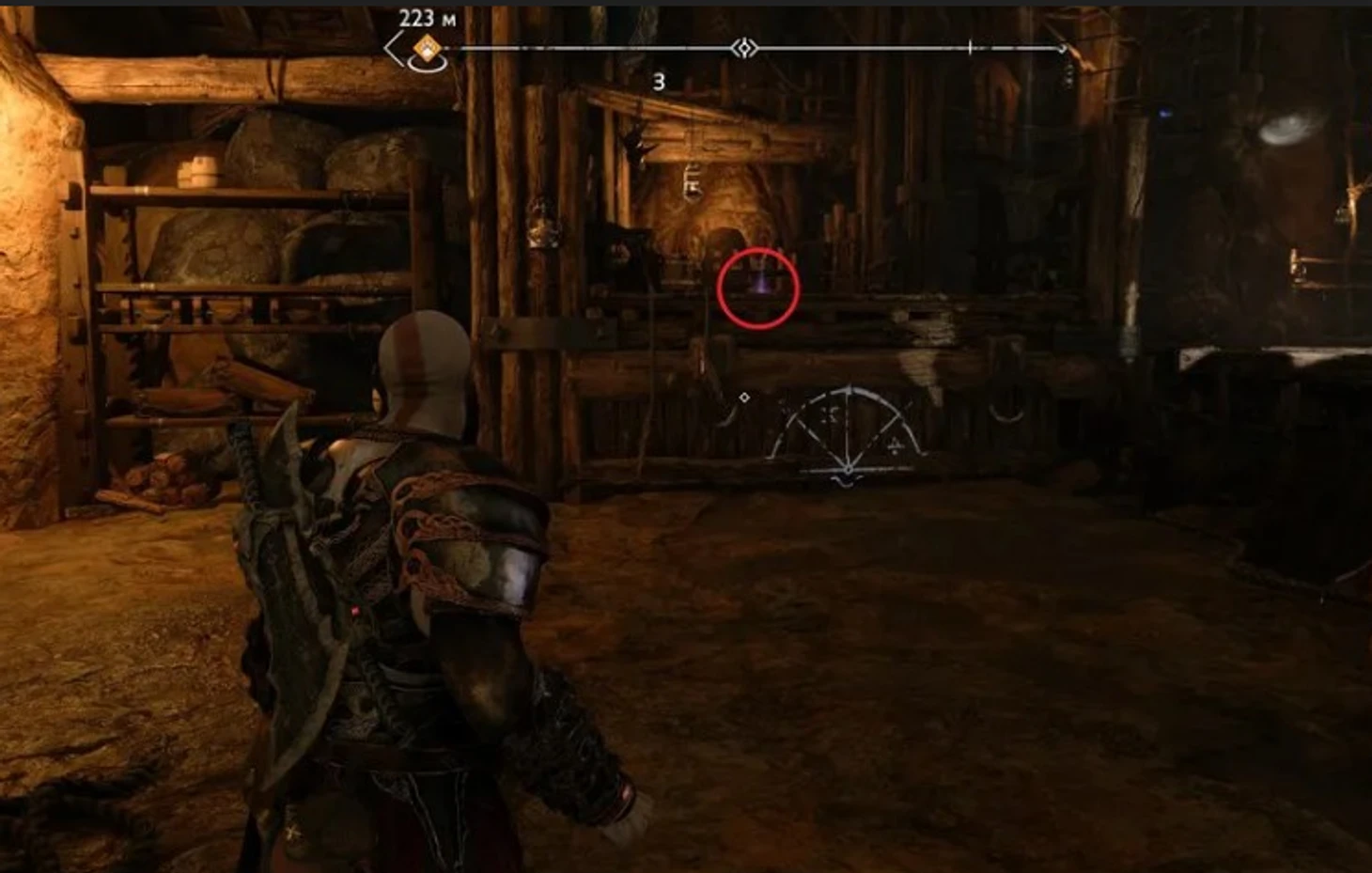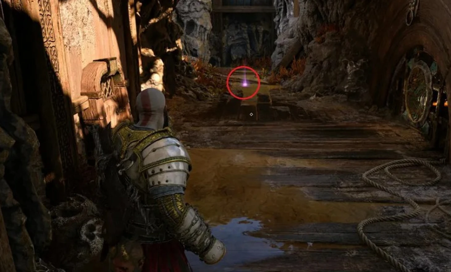 Вам нужно прибыть в Нидавеллир. Вы это сможете сделать в рамках квеста «Путь к Тюру». Здесь вас ждет встреча с Синдри, который даст вам новую способность, обновив лук Атрея. Возвращайтесь к причалу. Справа у вас будет преграда, которую нужно уничтожить с помощью лука. Забирайте Артефакт.