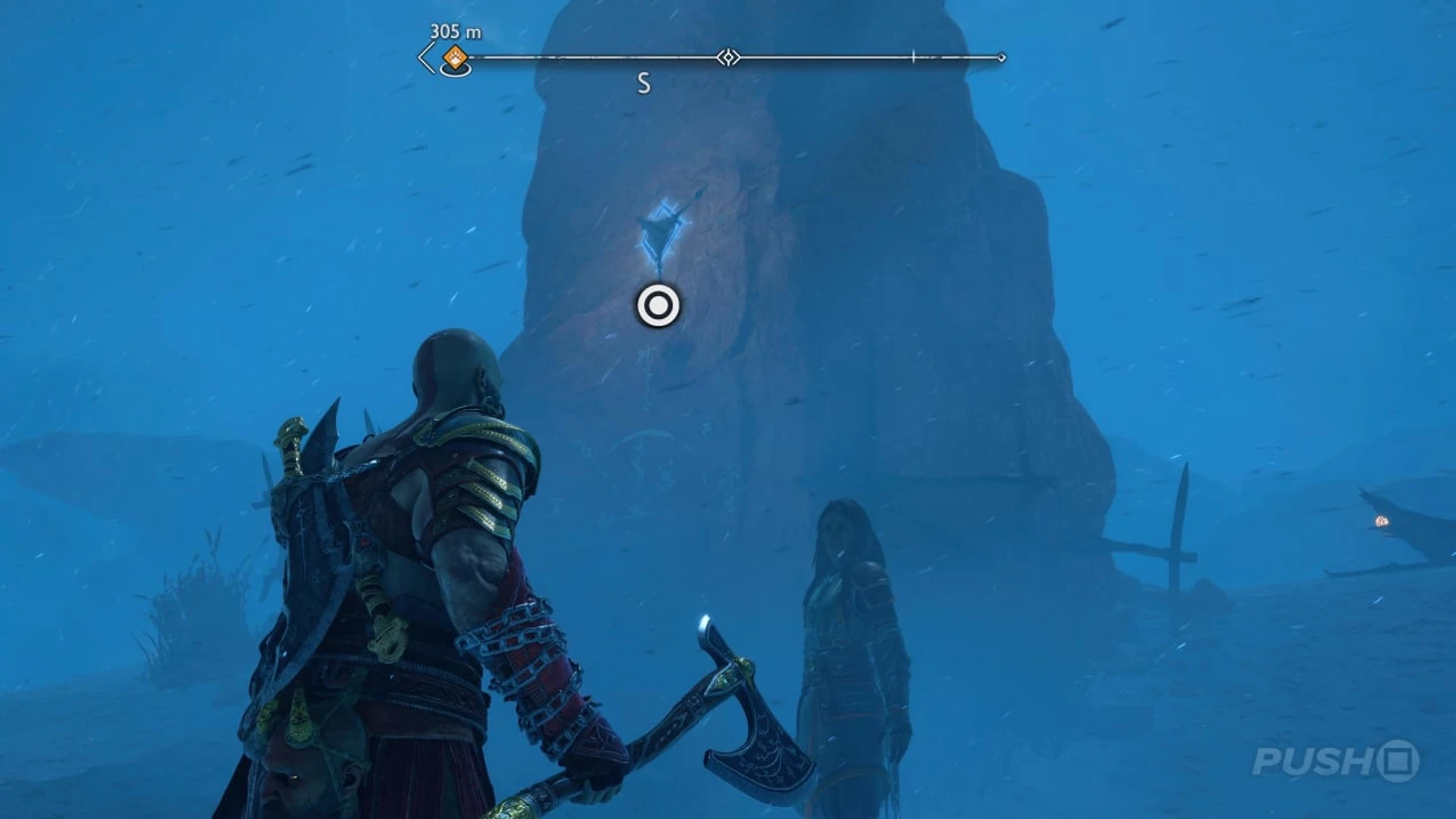 Выполняя задание «Путь к Тюру», вы должны отправиться в путешествие на лодке и найти пляж с гейзером. Здесь вам понадобится топор для заморозки гейзеров. Когда вы заморозите источники, ищите точку захвата и постарайтесь зацепиться за выступ, чтобы попасть наверх. Там находится нужный предмет.
