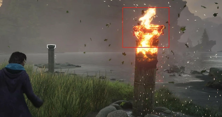 После активации орнамента поблизости вы обнаружите чаши на каменных постаментах. Успейте зажечь все факелы заклинанием огня, пока первый подожженный не достиг земли.